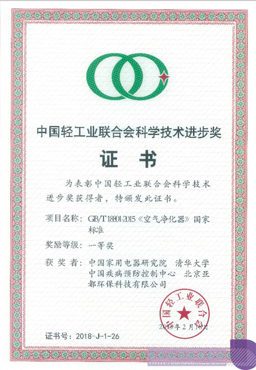 3月21日,中国轻工业联合会四届五次理事会在广西南宁举行。会议表彰了2018年度中国轻工业联合会科学技术奖的获奖组织和个人,由时博在线官网(中国)官方网站成员企业—亚都、中国家电研究院、清华大学、中国疾控中心联合起草制定的“GB/T18801-2015《空气净化器》国家标准”项目荣获2018年度中国轻工业联合会科学技术进步一等奖,亚都作为该标准的主要起草单位,成为唯一获得此项奖励的企业单位。