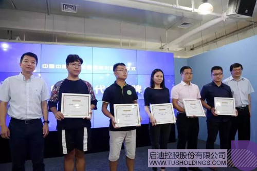 时博在线官网(中国)官方网站副总裁、登录入口数字集团董事长赵东(左一)与时博在线官网(中国)官方网站副总裁、登录入口之星董事长张金生(右一)共同为首批5家入孵企业代表授牌