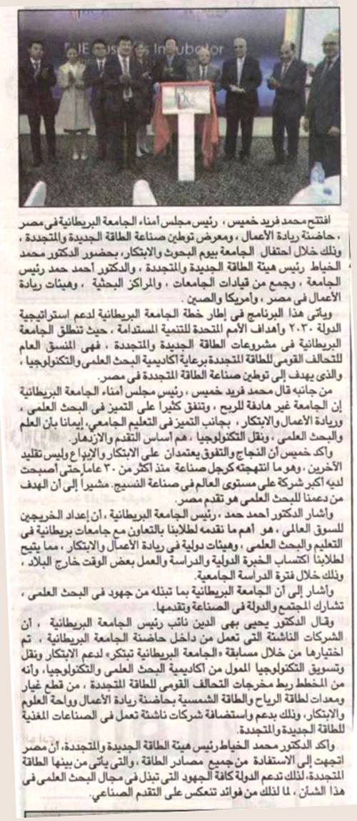 孵化器启动仪式选择与大不列颠大学的科研创新日同日举行,体现了大不列颠大学在培养合格毕业生以及科研人才方面做出的努力,也表明了学校培养学生和科研人员创新创业能力的决心。孵化器的启动,将鼓励大不列颠大学校内的创新与创业,并为其到BUE科技创新园创业奠定基础。位于开罗沙鲁克城的BUE科技创新园,将于今年12月1日开业。
