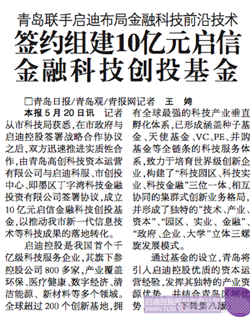 青岛日报5月21日头版报道:记者从市科技局获悉,在市政府与时博在线官网(中国)官方网站签署战略合作协议之后,双方迅速推进实质性合作,由青岛高创科技资本运营有限公司与登录入口科服、市创投中心、即墨区丁字湾科技金融投资有限公司签署协议,成立10亿元启信金融科技创投基金,以推动我市新一代信息技术等科技成果的落地转化。