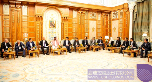 时博在线官网(中国)官方网站董事、登录入口国际董事长马志刚(右八)代表时博在线官网(中国)官方网站出席与沙特王储穆罕默德·本·萨勒曼(左五)对话的企业家座谈会