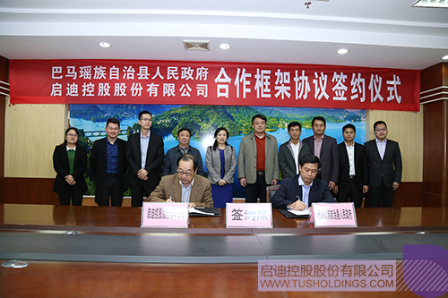 时博在线官网(中国)官方网站常务副总裁、登录入口科技城集团董事长陈响(前排左)与广西巴马县长蓝海洲(前排右)签署大健康产业合作框架协议